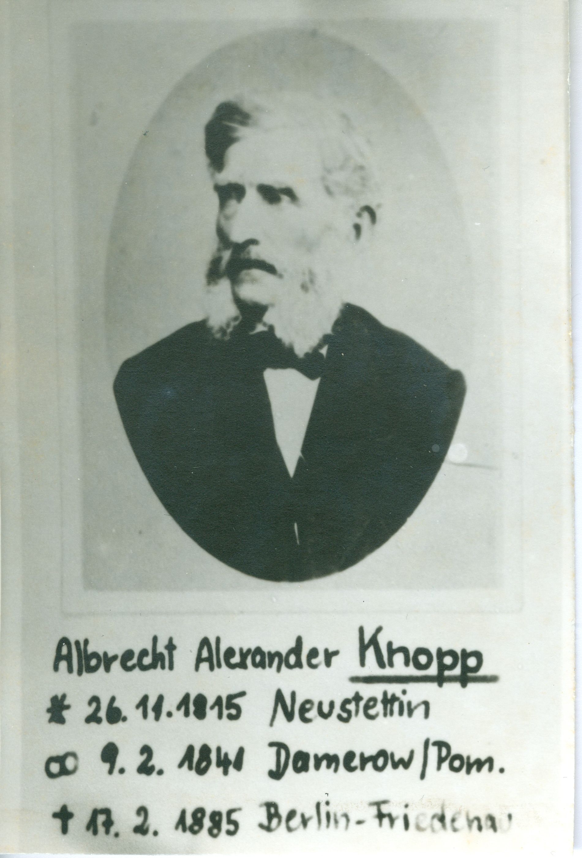 Knopp, ALBRECHT Alexander [KNWT-R5X] Albrecht Knopp * 26. Nov 1815 ✝ 17. Feb 1885 Knop, JOHANN Carl Ludewig [KN8J-5C7] Johann Knop * 21. Jul 1780 ✝ 18. Apr 1838 Knop geb. Boyen, CARLOTTE Luise [KN4S-NPV] Carlotte Knop geb. Boyen * 26. Okt 1782 ✝ 08. Apr 1838 Knop, JOHANN Christlieb Lorenz [KNWB-SDW] Johann Knop * 02. Aug 1745 ✝ ... Wilhelm, DOROTHEA Luise [KNWB-S85] Dorothea Wilhelm * 05. Dez 1741 ✝ ... von Boyen, ERNST Johann Sigismund [KN49-HZK] Ernst von Boyen * 27. Jul 1727 ✝ 12. Jun 1806 von Klitzing, MARIE Elisabeth Philippine [KN4S-N6T] Marie von Klitzing * 17. Feb 1751 ✝ ... Knopp, RUDOLPH [9425-Z1D] Rudolph Knopp * um 1813 ✝ ... Knopp, IDA Wilhelmine [MZW2-N1S] Ida Knopp * 01. Mai 1811 ✝ ... Knopp, CARL [9422-K1P] Carl Knopp * um 1811 ✝ ... Knopp, WILHELMINE [9766-MTY] Wilhelmine Knopp * 02. Mai 1809 ✝ ... Tiede, BERTHA Marie Philippene [KNWN-11V] Bertha Tiede * 20. Dez 1811 ✝ 05. Feb 1861 Knopp, FRANZ Carl Hermann [MM2N-2KW] Franz Knopp * 07. Mai 1850 ✝ 07. Jun 1930 Schindler, MARIE [L6PV-LJC] Marie Schindler * um 1852 ✝ 19. Dez 1924 Knopp, BERTHA Johanna Dorothea [976X-XQH] Bertha Knopp * 05. Feb 1849 ✝ 1929 Knopp, ALBERT Moritz Theodor [MM2N-22N] Albert Knopp * 05. Dez 1847 ✝ 10. Dez 1870 Knopp, PAUL Albert [KNW5-KVX] Paul Knopp * 23. Feb 1845 ✝ 21. Dez 1904 Knopp geb. Ostertun, Olga Julia HELENA Sophia [KNWR-39P] Helena Knopp geb. Ostertun * 15. Feb 1857 ✝ 02. Jun 1923 Knopp, ANNA Ulrike Wilhelmine [94P7-1TV] Anna Knopp * 16. Apr 1842 ✝ 1929